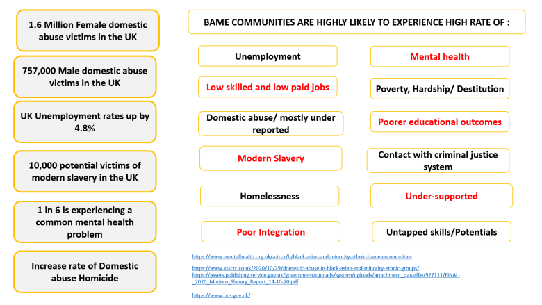 With the lasting impact of Covid-19 and the continuous hardship faced by the BAME communities, we aim to transform and rebuild lives. We are addressing hardship from the root. We understand that socio-economic and political factors like immigration, unemployment, systemic barriers, mental health, domestic abuse, homelessness, destitution, and poor integration, social and cultural exclusion are playing a big role in hardship. With the dire need to reduce poverty and hardship, we are using our services to change lives and change our communities.